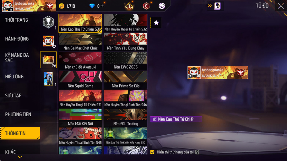 Xem thêm Acc Acc Free Fire Tự Chọn khác